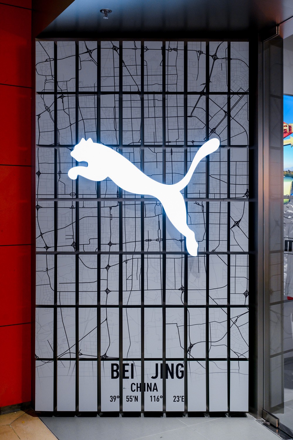 PUMA 标志性的 “美洲狮” 图案跃然于北京门店限定的地图主题墙上,象征着 PUMA 与当地文化的融合。