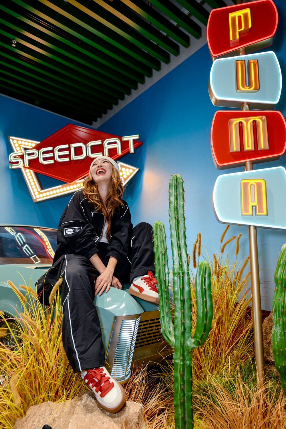 门店入口处还特别打造 Speedcat 主题展示区,从全球品牌代言人 Rosé 的最新公路大片中汲取灵感,仿佛穿梭在开阔的高速公路与山脉之间,感受自由驰骋的快感。