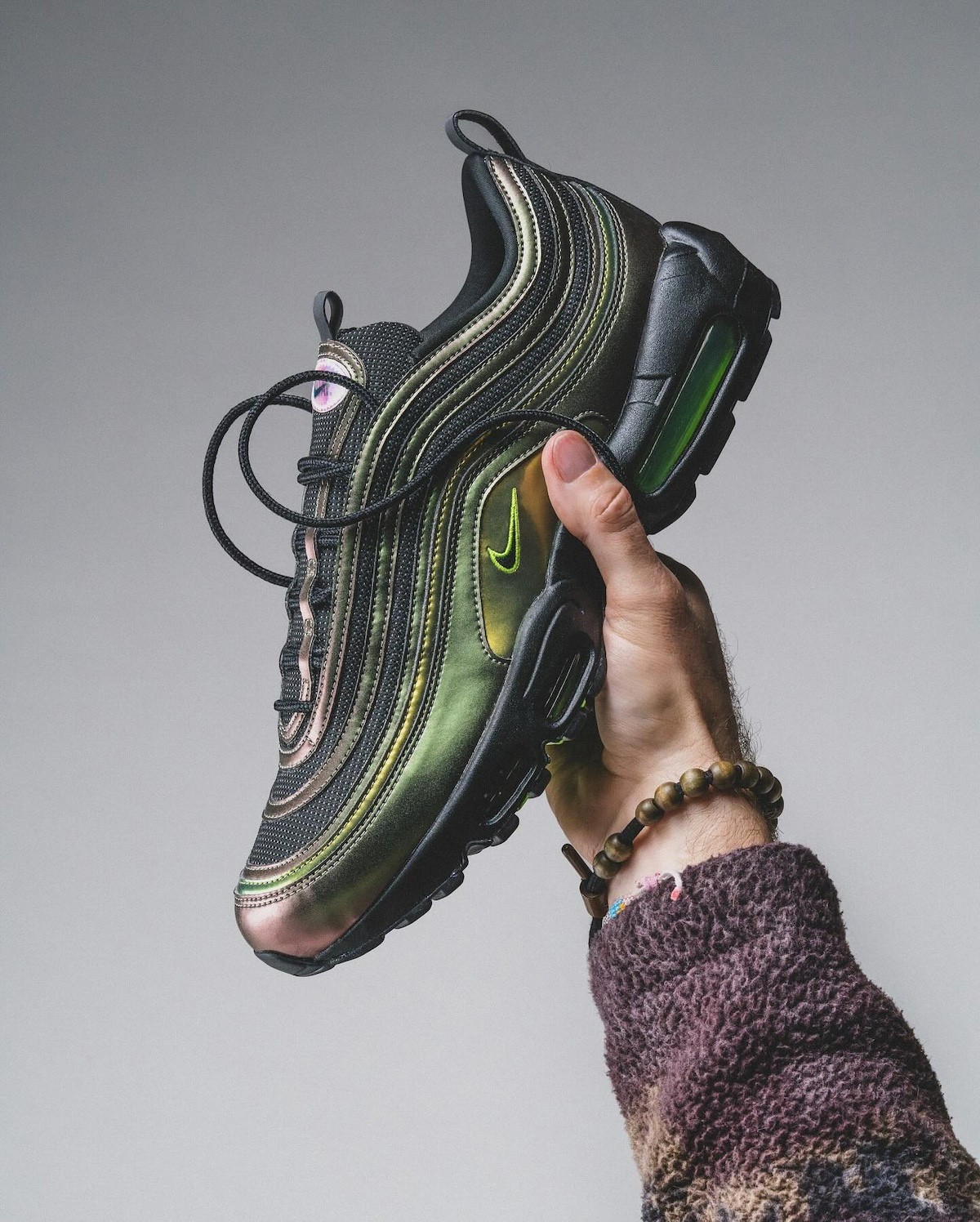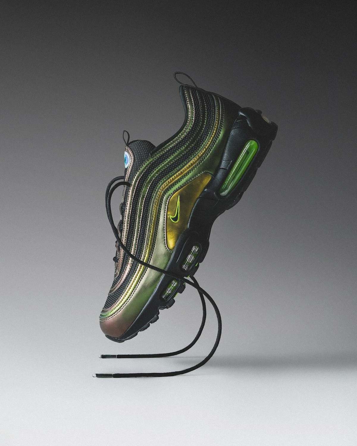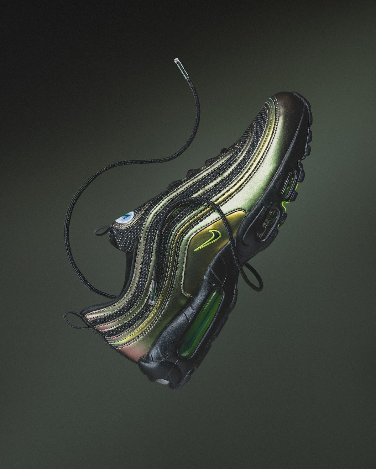 设计方面,结合了两大人气 Air Max 鞋款的经典设计,用的是 Air Max 97 鞋面 + Air Max 95 外底。